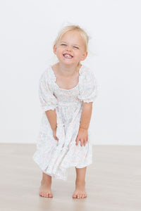 Our Smocked Ruffle Dress is Mila's new favorite dress.  From the moment she tried on the first sample, she didn't want to take it off.  She even wore the sample to school the next day.  Smocked bodice is comfortable and stretchy.  Ruffle skirt makes this dress extra twirl-worthy.  Perfect for both formal occasions and everyday adventures.  Your little one is sure to love this dress!