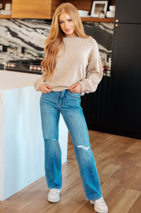 Stay stylish and cozy with our String Me Along Pearl Accent Sweater. Made from lightweight knit, this sweater features faux pearl accents, a ribbed crew neckline, dropped shoulders, and puff sleeves. Perfect for adding a touch of elegance to any outfit.